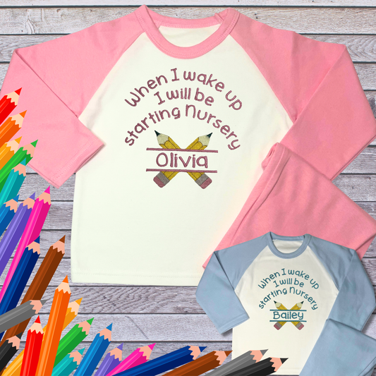 Personalised Embroidered Children's Pyjamas: Starting Nursery School Pencil Design