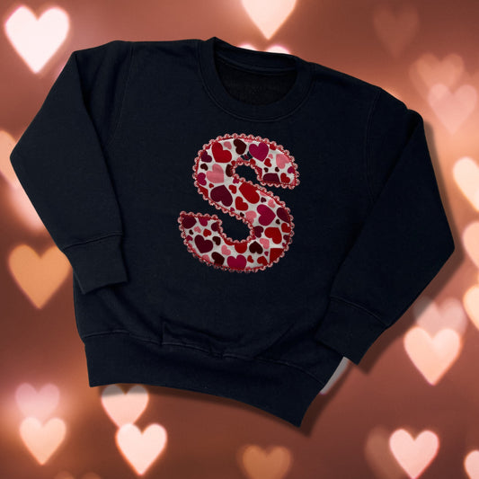 Embroidered Children's Valentine's Shirt. Monogram Initial Using a Cute Heart Design Fabric Surrounded with a Lace Effect Embroidered Border