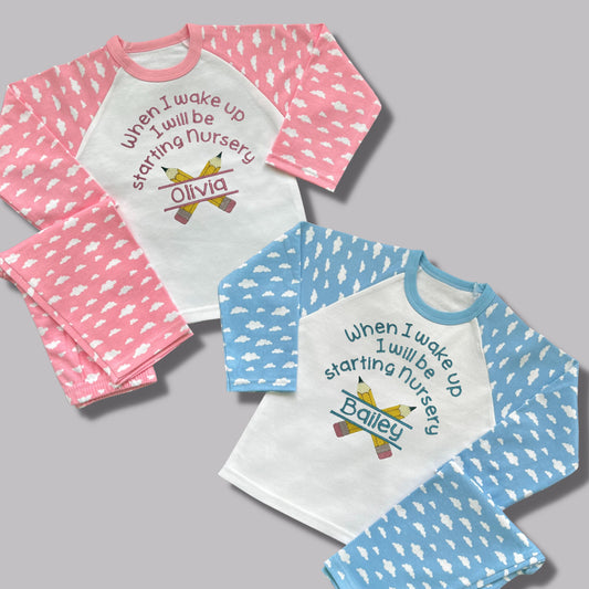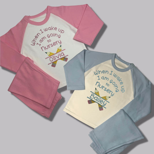 Childrens Personalised Embroidered Pyjamas Saying 'When I wake up I will be starting nursery'. Cute Pencil Design with Child's Name.