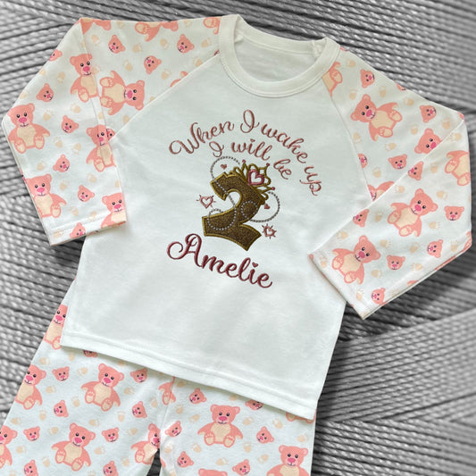 Childrens Personalised Embroidered Pyjamas and Sleepsuits. When I wake up I will be'. Cute Princess Crown Birthday Design with Child's Name.