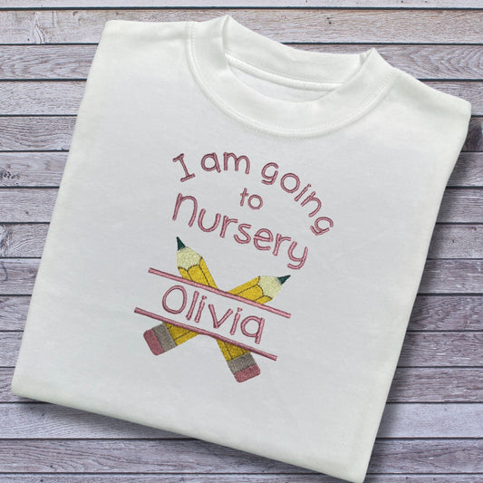 Personalised Embroidered 'I am going to nursery' Top. Cute Pencil Design in Blue or Pink Personalised with Child's Name. Choice of Garment.