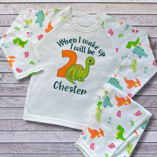 Childrens Personalised Embroidered Birthday Pyjamas 'When I wake up I will be' Embroidered Cute Dinosaur Design with the Childs Name and Age