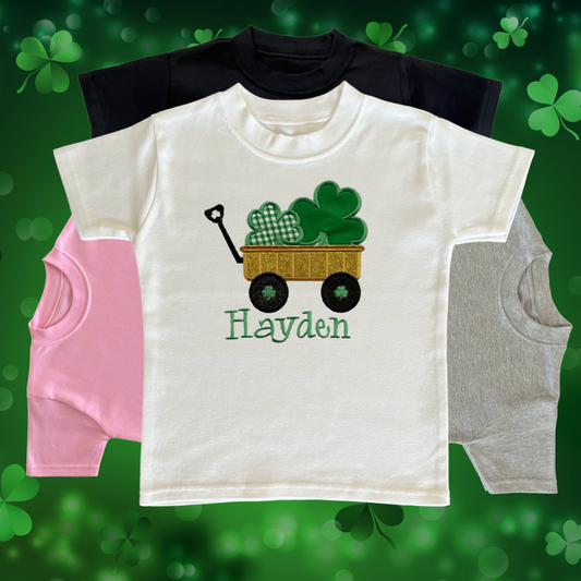 Personalised Embroidered Children's St Patrick's Day Glittery Cart of Shamrocks