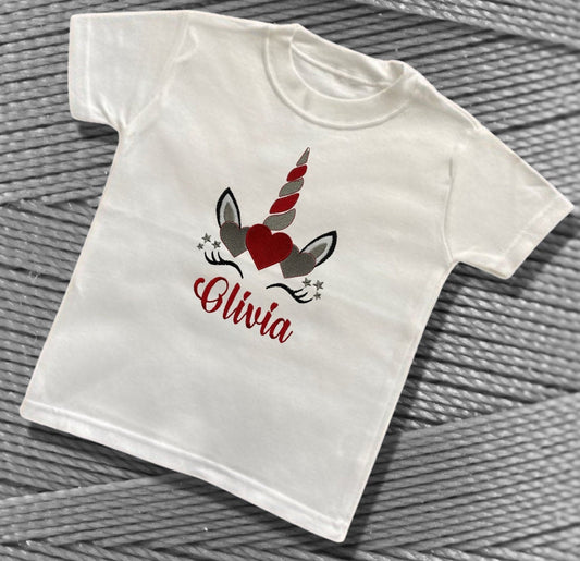 Personalised Embroidered Childrens Unicorn Shirts. Cute Unicorn with Hearts Design. Perfect Outfit for Valentines Day or a Gift