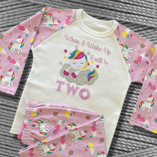 Childrens Embroidered Birthday Pyjamas. Unicorn Design With the Words 'When I Wake Up I'll Be..' Perfect for the Night Before Their Birthday