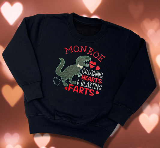 Embroidered Children's Valentine's Shirt. Cheeky Dinosaur Design Saying ''Crushing Hearts & Blasting Farts" Personalised with Child's Name.