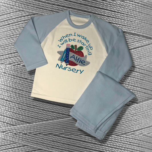 Childrens Personalised Embroidered Pyjamas Saying 'When I wake up I will be starting nursery'. Cute Pencil Design with Child's Name.