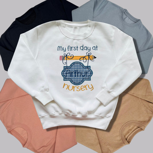 Personalised Embroidered 'My first day at nursery' Tops. Personalised with Child's Name in a Cute Colourful Crayon Font. Choice of Garment