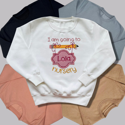 Personalised Embroidered 'I am going to nursery' Top. Cute Pencil Design in Blue or Pink Personalised with Child's Name. Choice of Garment.