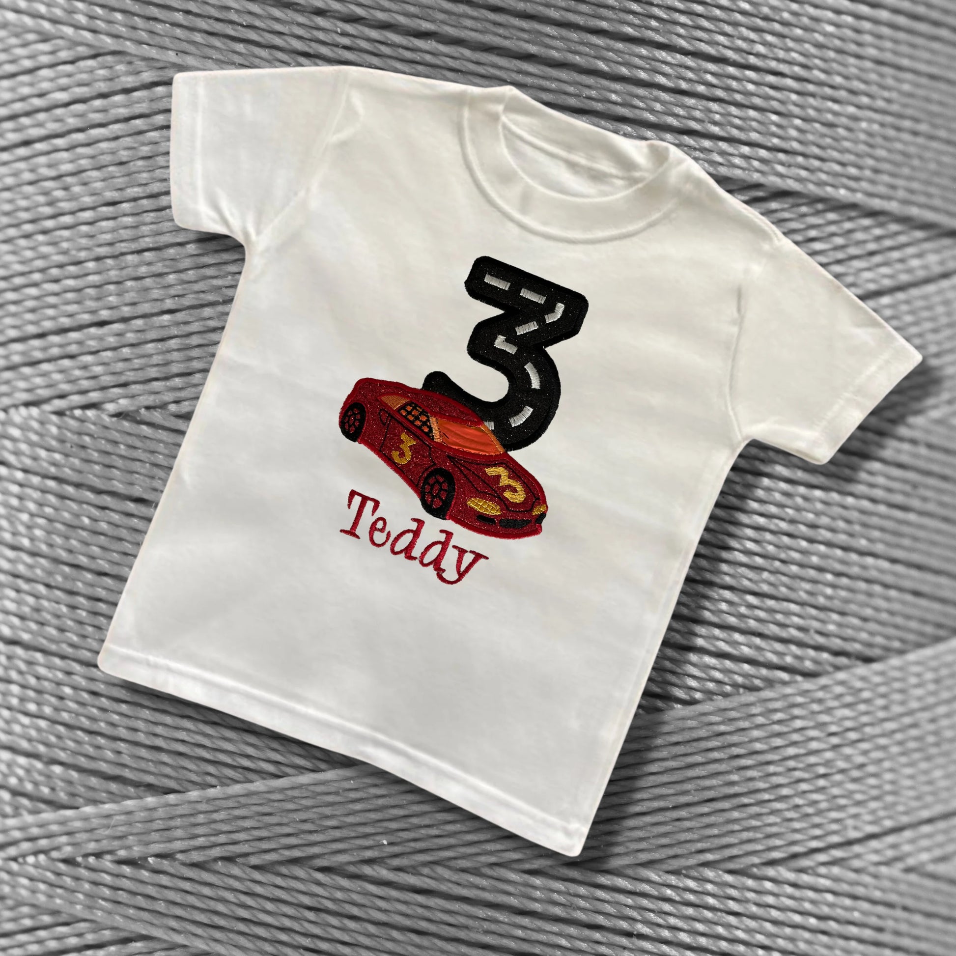 Personalised Embroidered Children's Birthday top: Racing Car Design