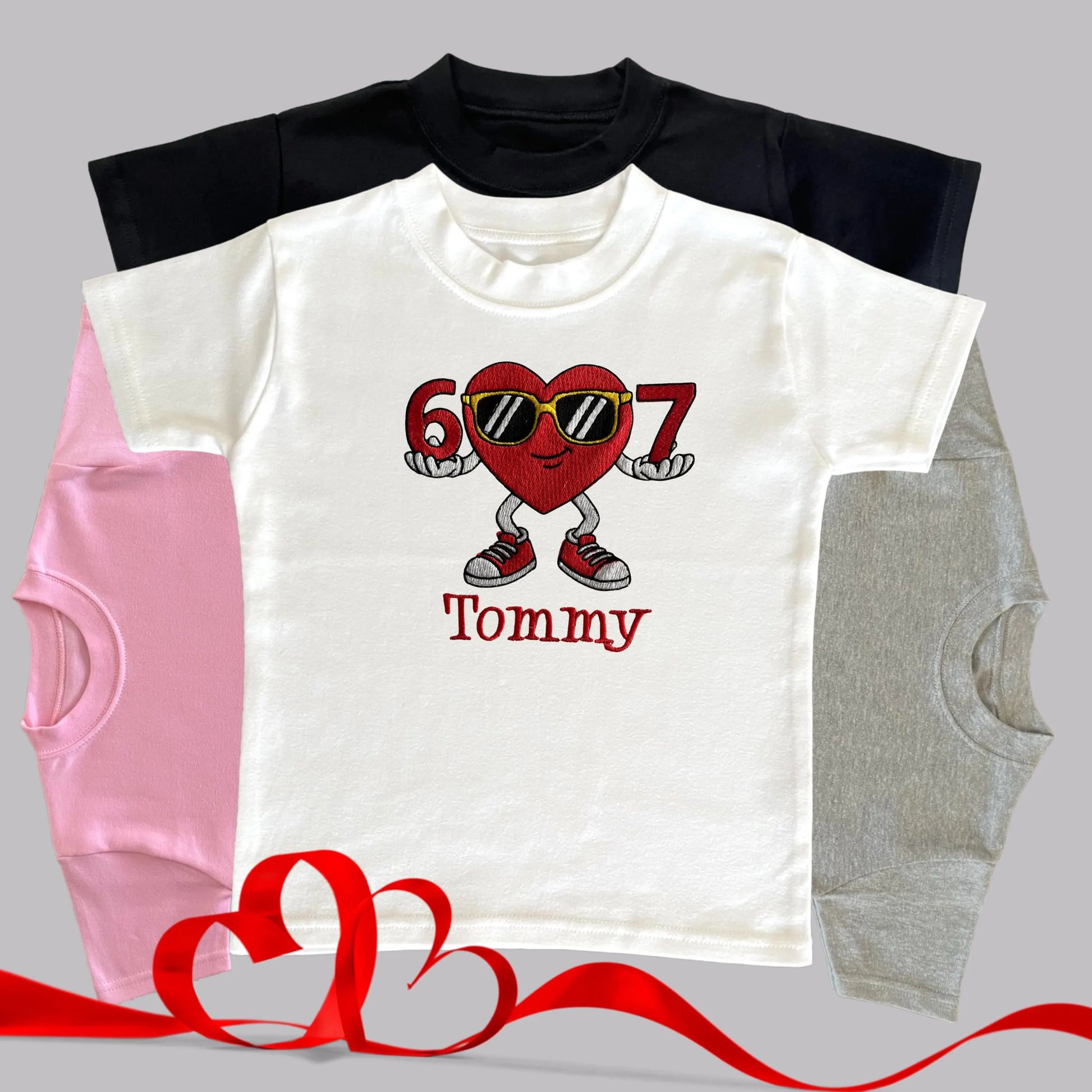 A Chid's Valentine's Top Embroidered with a Large Heart Character holding the Numbers 6 7 and the Child's Name Under the Design. Perfect for Children's Valentine's Day and a Great Gift.
