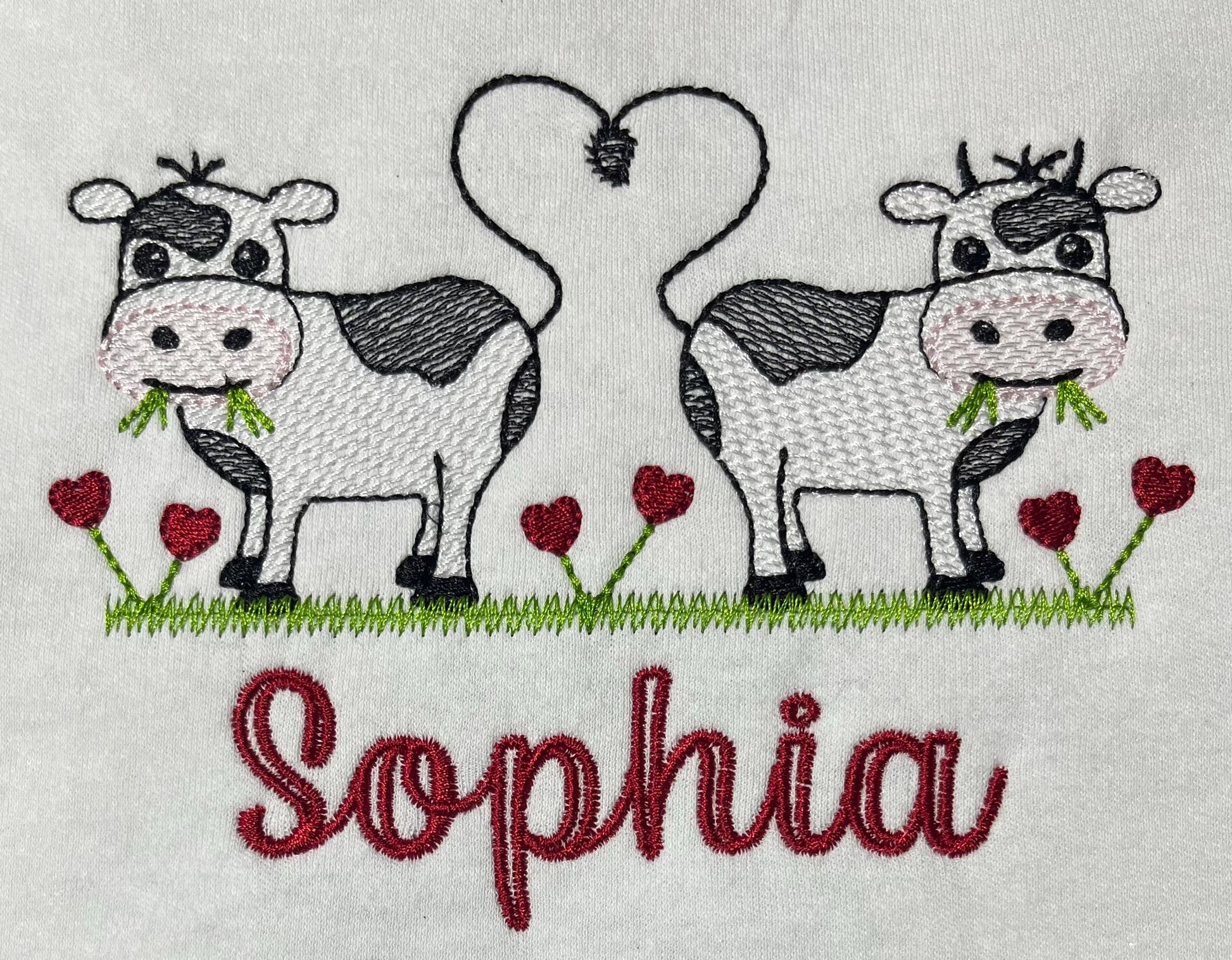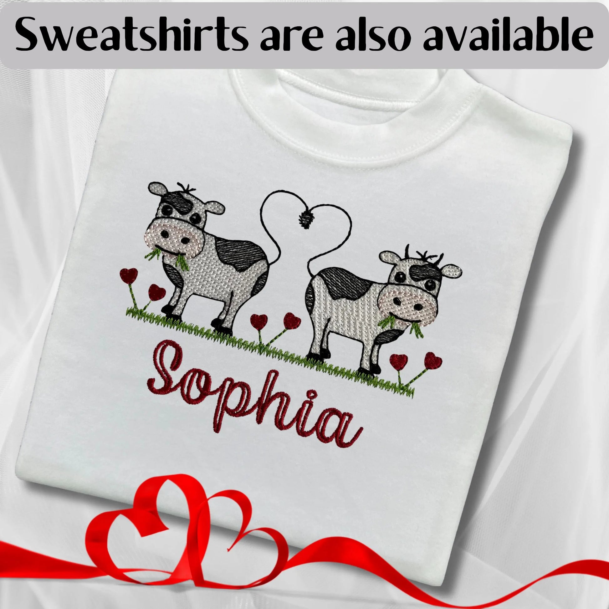 A Childs Sketch Design Valentine's Top Embroidered with 2 Cute Cows and the Child's Name Under the Design. Perfect for Children's Valentine's Day and a Great Gift.