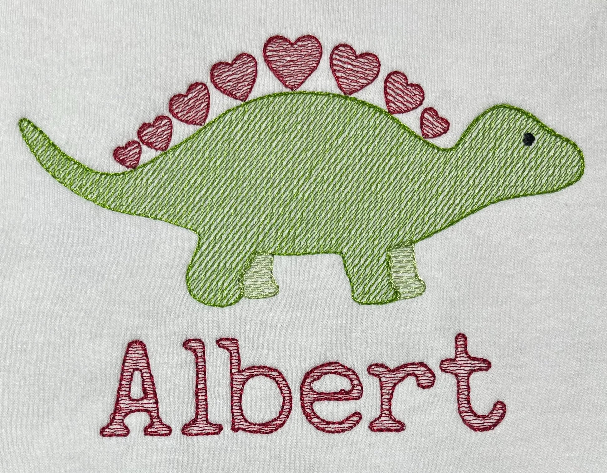 A Cute Dinosaur Sketch Style Valentine's Top Embroidered with the Child's Name under the Design. Perfect for Children's Valentine's Day and a Great Gift.