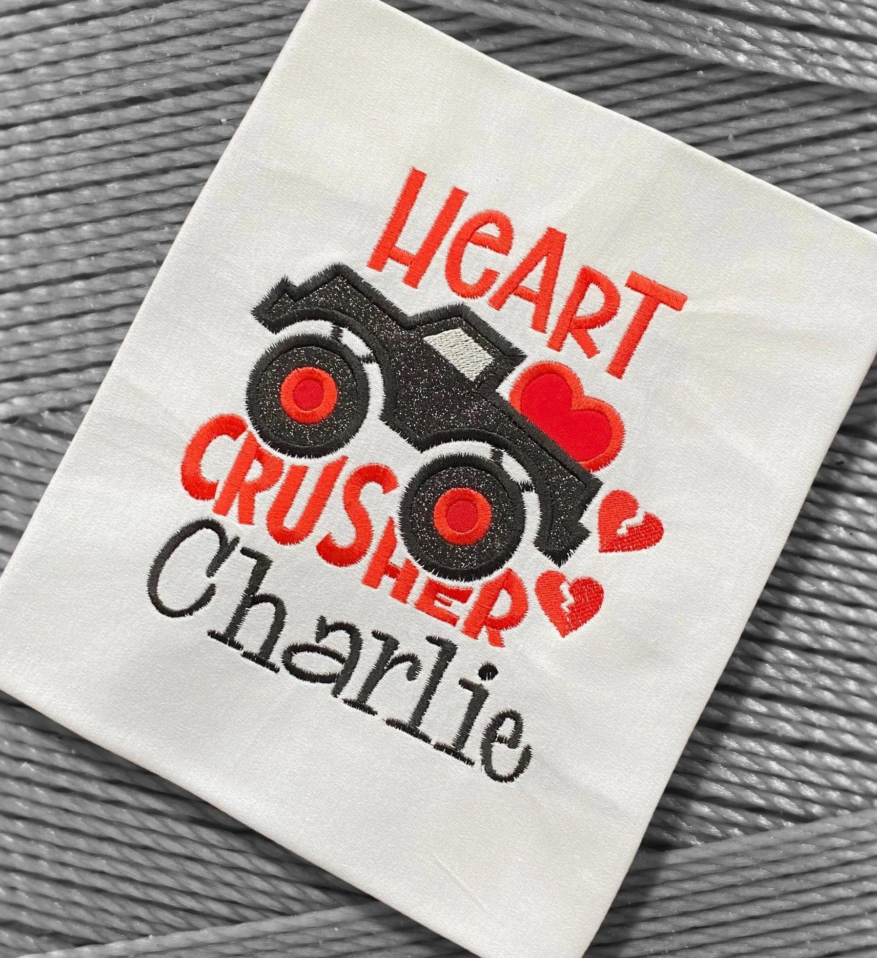 A Super Cute Embroidered Applique Personalised Shirt with a Black Sparkly Truck carrying a Heart and the Words 'Heart Crusher'. Perfect for Children's Valentine's Day and a Great Gift.
