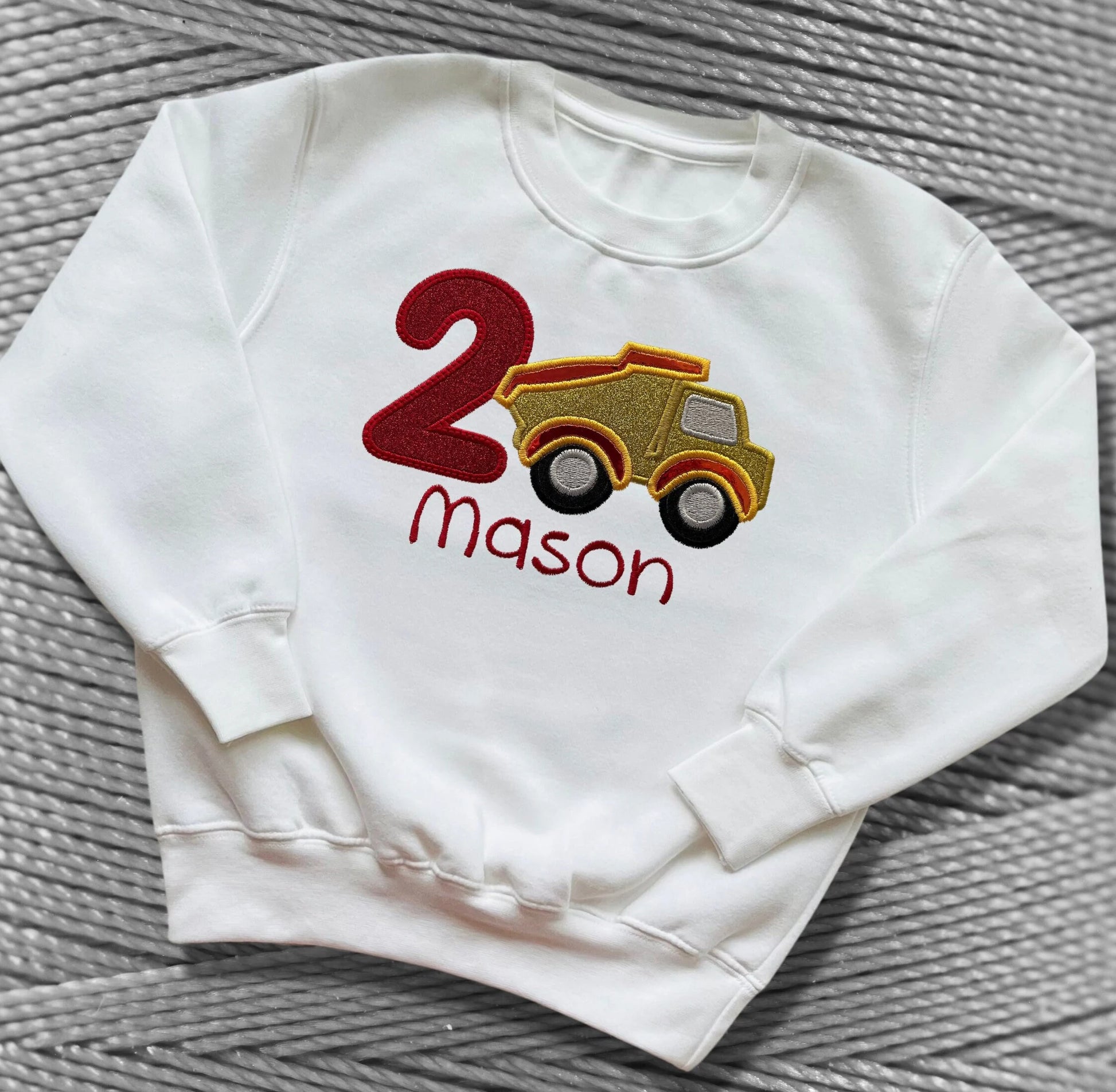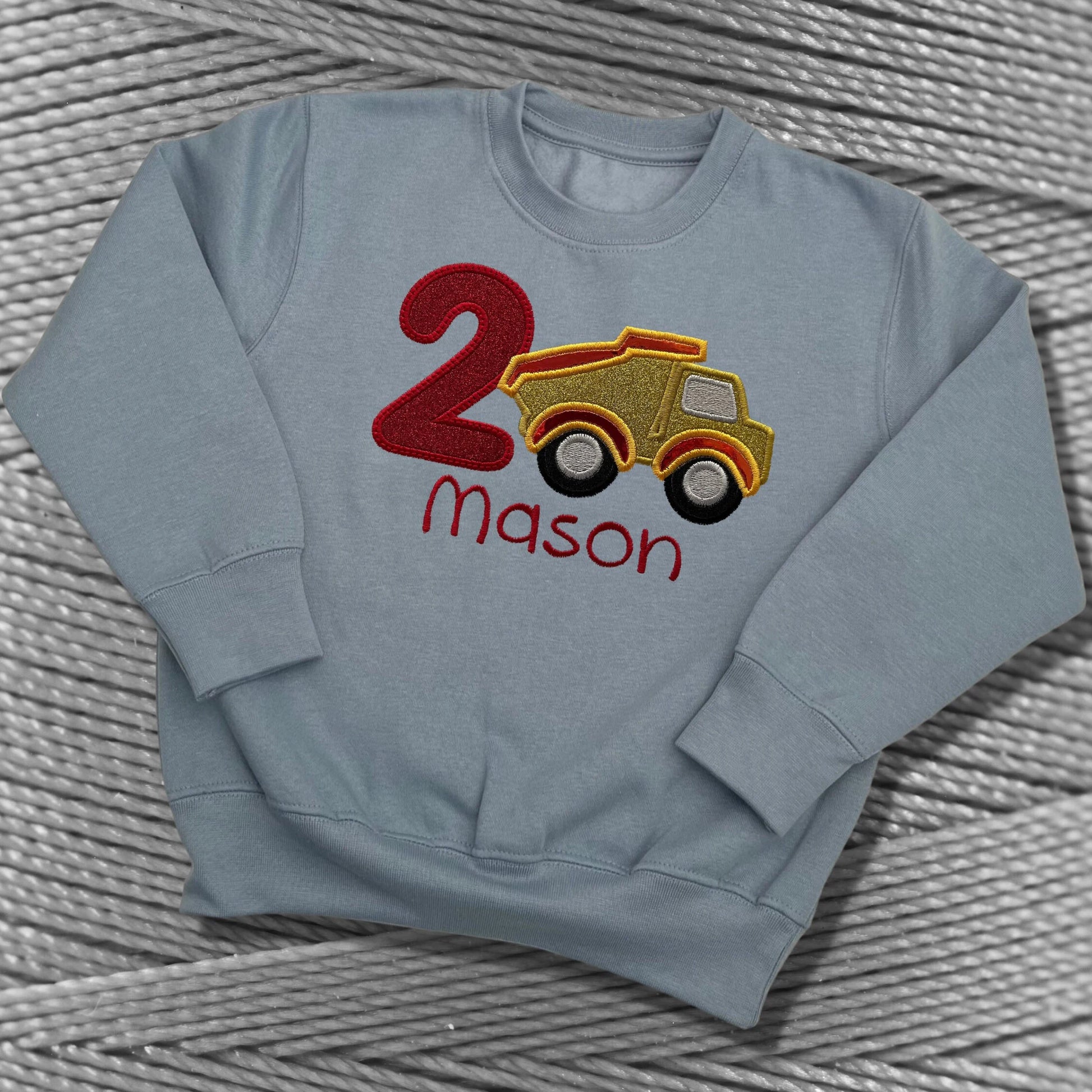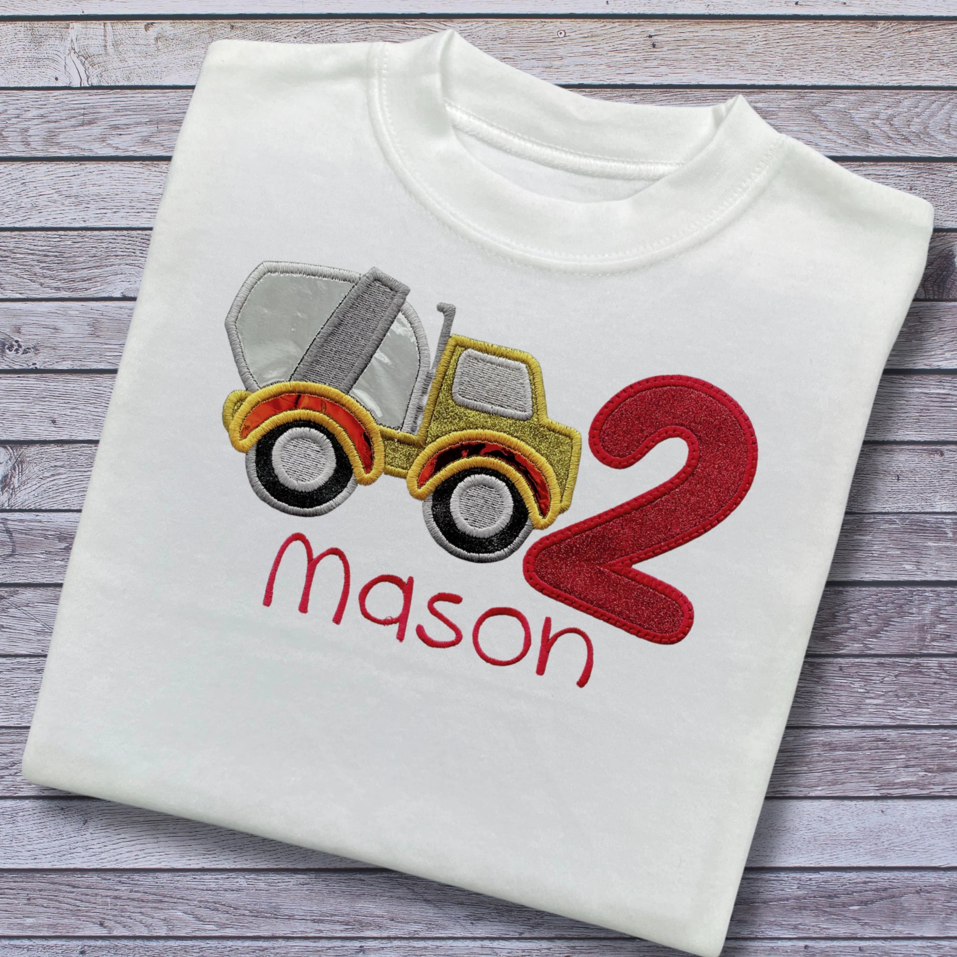 A Super Cute Personalised Birthday Top. Embroidered Applique Construction Vehicle with the Age in Red Glittery Soft Vinyl with an Embroidered Border. The Construction Vehicle Uses a Selection of Glitter, Crome and Camelion Vinyls, all with Embroidered Edges and then Beautifully Finished with the Childs Name Embroidered in Red Underneath the Design. Choice of Design and Garment. Perfect for Kids Birthdays.