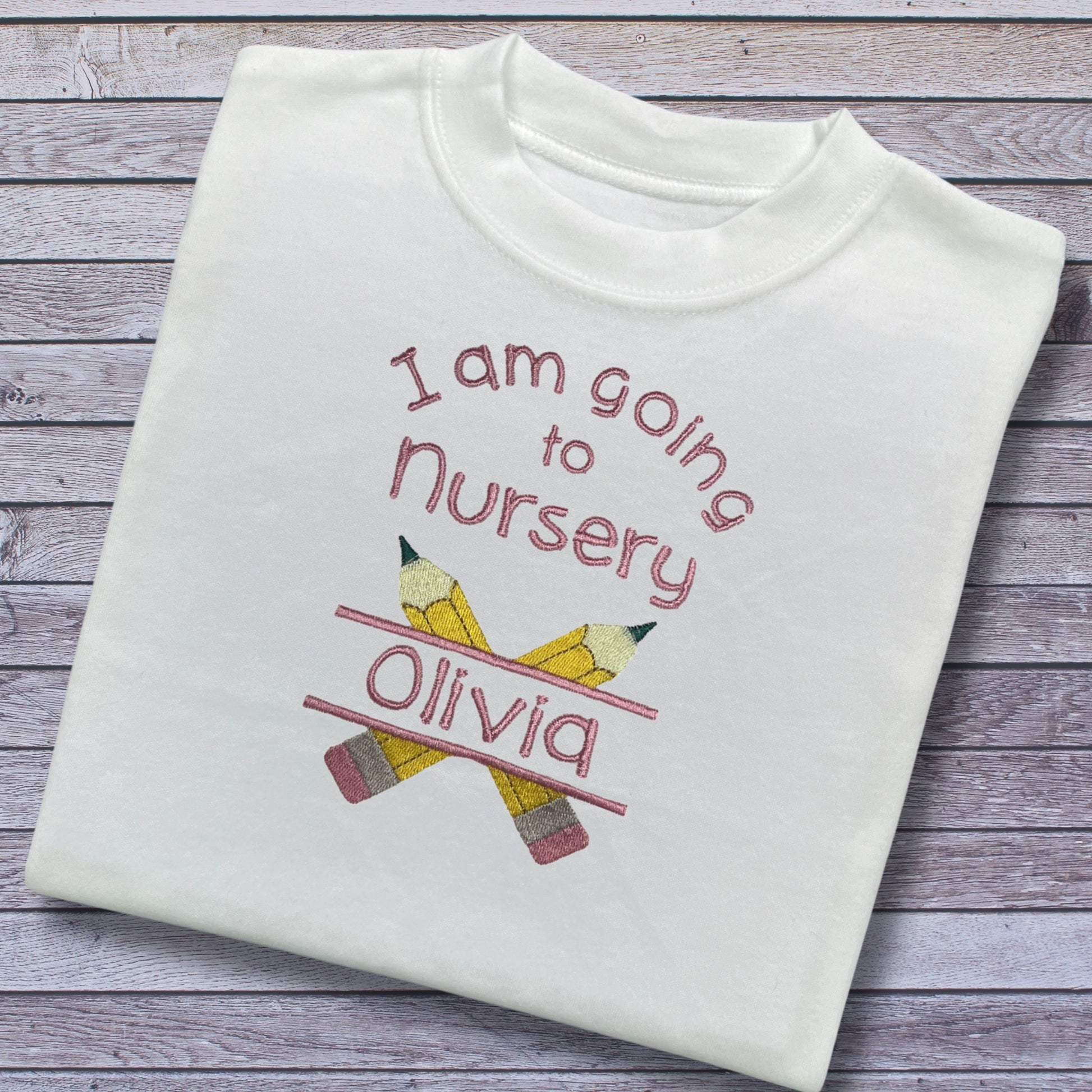 Personalised Embroidered 'I am going to nursery' Top. Cute Pencil Design in Blue or Pink Personalised with Child's Name. Choice of Garment.