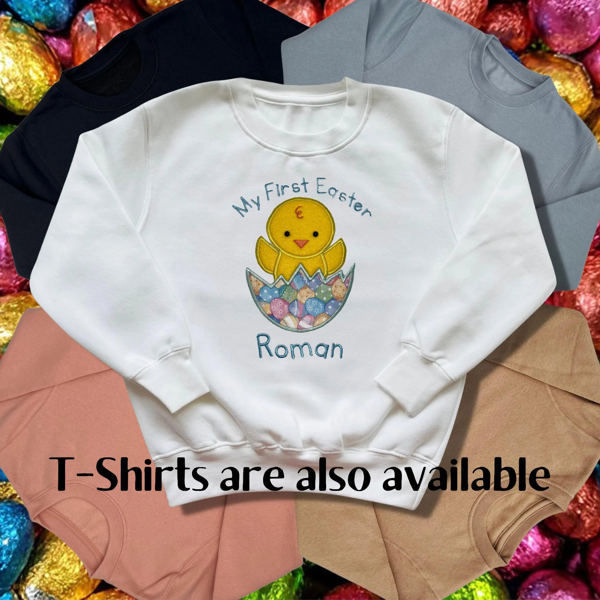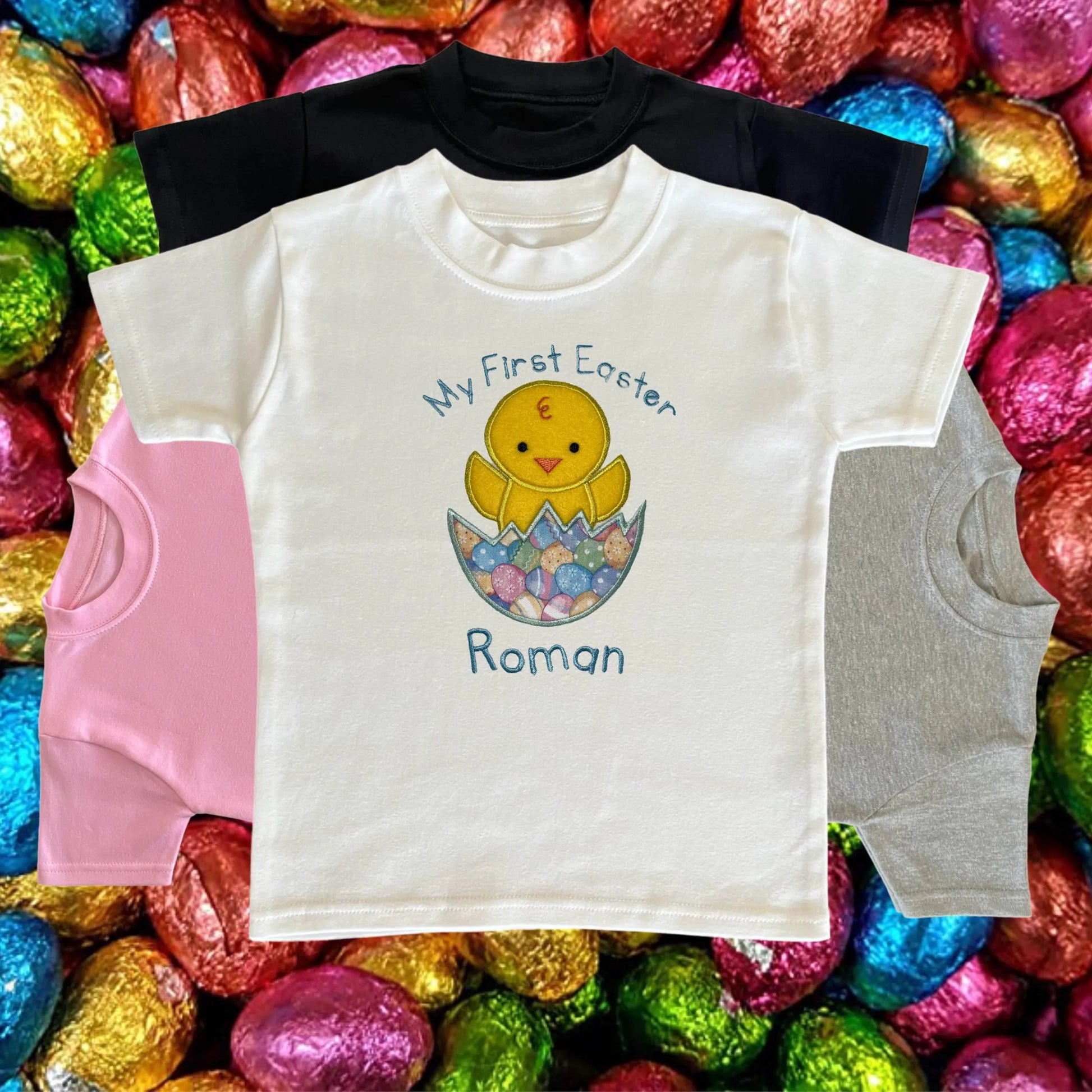 Super Cute Embroidered and Personalised Easter Tops. A Cute Chick Popping out of its Egg with the Child's Name Embroidered Underneath and the Words My 1st Easter Above Using Either Pink or Blue Thread. Perfect Top for Children's First Year of Easter Fun.